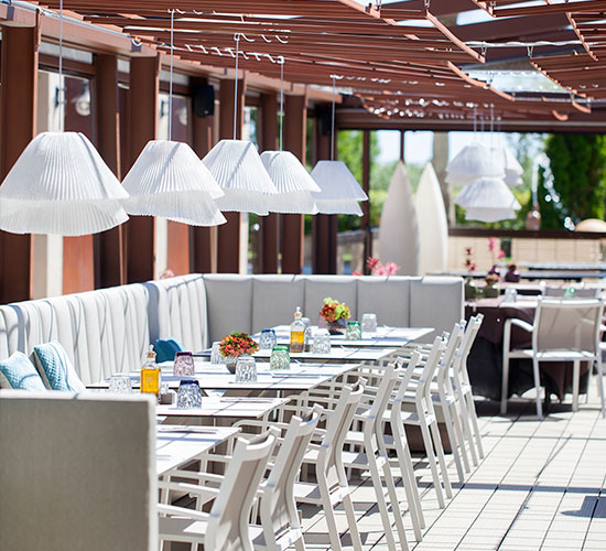 The Mas Gusó restaurant designed by Mercé Borrel has an outdoor terrace where our Tempo Vivace design illuminates the tables.