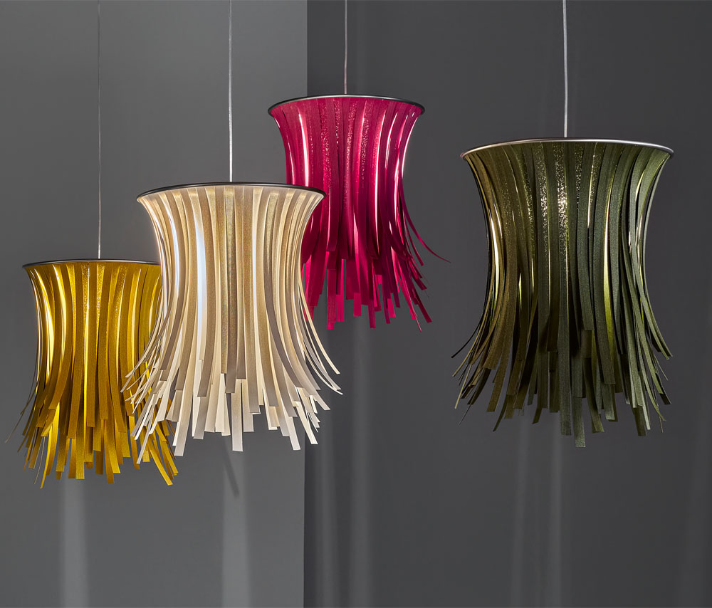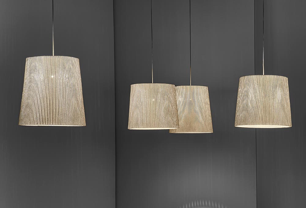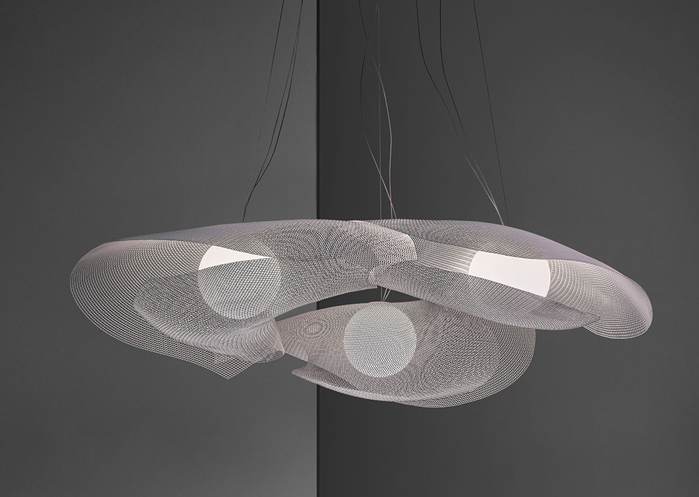 La colección Virginia hace honor a la escritora británica Virginia Wolf. Este diseño minimalista hecho de malla de acero inoxidable, tiene las características necesarias para la creación de composiciones en espacios interiores con sus versiones de pie y colgantes.