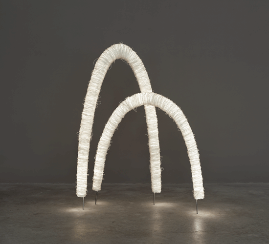 Inspired by the beautiful arcades of Santiago de Compostela, this collection designed by Arturo Álvarez is a particular tribute to the old master craftsmen of the city. Arc large floor lamp is a piece composed of two crossed arches that contrast their large architectural volume with the softness of the Japanese cord that surrounds them. The LED light that runs through them from one side to the other is diffused in a uniform and elegant way, generating authentic light sculptures.