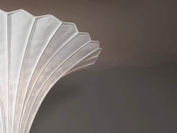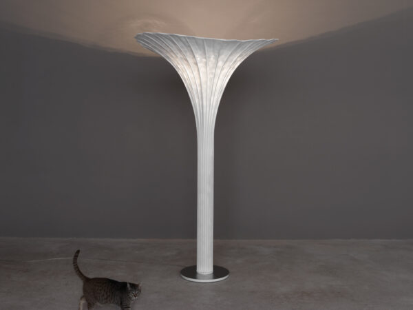 Africa is an exuberant free-standing luminaire of imposing height and sculptural volume. Its smooth, firm skin, made of painted stainless steel mesh, lets the light escape as it ascends in a beam shape through the conical structure to expand completely at the top. A stylized presence, reinforced by the verticality of the lines that furrow it, handmade in Spain. The Africa floor lamp, majestic and elegant, was designed by Arturo Álvarez.