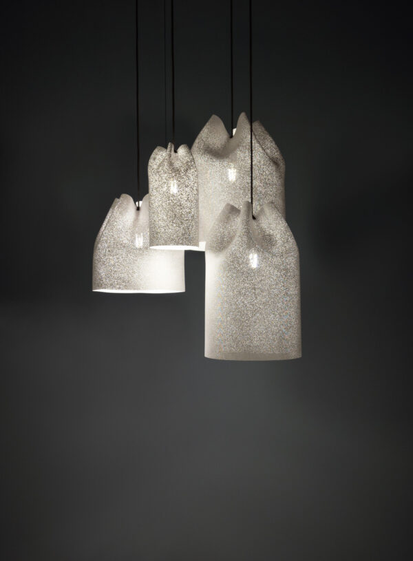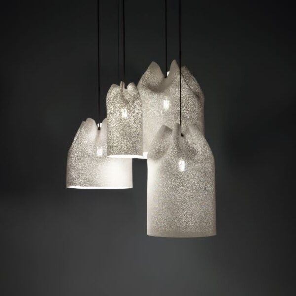 Agasallo, which means gift in Galician, is Héctor Serrano’s new collection. Its shapes and its hand painted generate unique light effects that are projected into the space creating a unique atmosphere. Available in four pendant sizes that can be combined at different heights creating multiple compositions. Agasallo Composition combines the 4 models of this collection creating a gorgeous chandelier. Its shapes and hand-painted in Spain generate unique light effects that are projected in space.