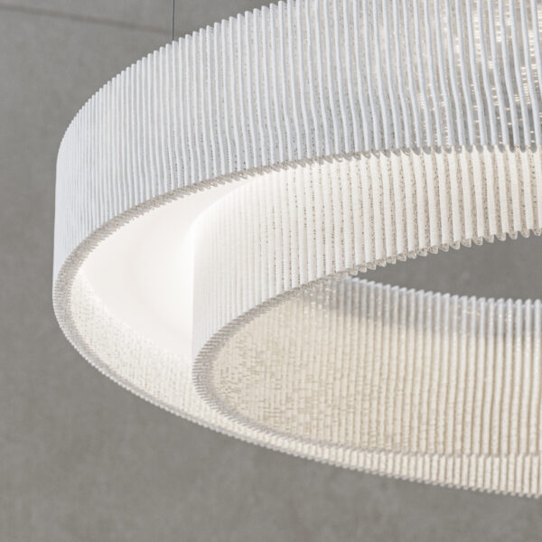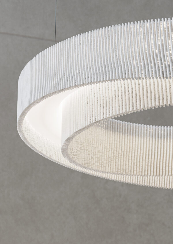 We present a new 90 cm diameter version of the Anel lamp, designed by a·emotional light design team. This lamp combines volumes and lines that define its personality. The texture of the painted steel mesh with the ring-shaped diffuser creates a unique space. The incorporation of this new format allows for vertical compositions or more organic distributions, alternating sizes and giving free rein to the imagination.