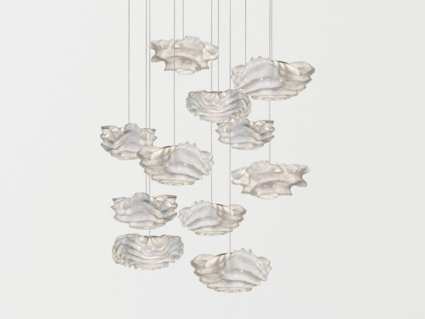 Una colección que refleja la extrema maleabilidad del malla de acero inoxidable pintado mejor que ninguna. La combinación de lámparas de todos los tamaños en una composición, presenta esas irrepetibles formas orgánicas características de la colección diseñada por Arturo Álvarez. Sus curvas, hechas a mano, convierten a cada una de las lámparas en única y diferente a todas las demás. Son volúmenes que parecen estar vivos, en constante evolución y movimiento, tanto por su forma como por los pliegues por los que la luz se extiende. Se trata de una de las colecciones más amplias de la marca, incluyendo colgantes, lámparas de mesa, apliques y composiciones en cascada.
