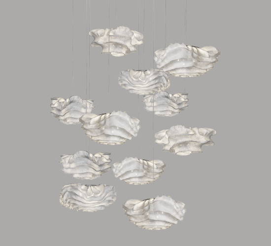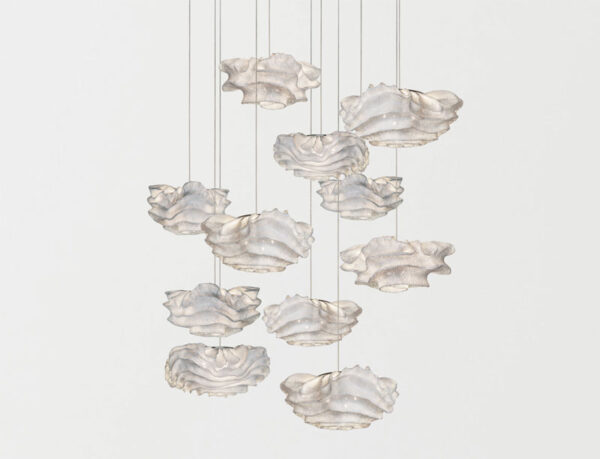 Nevo grande is one of the pendant lamps of the collection designed by Arturo Álvarez. A collection that reflects the extreme malleability of painted stainless steel mesh better than any other. The unrepeatable organic shapes of the Nevo, with its handmade curves, make each of the lamps unique, different from all the others. They are volumes that seem to be alive, in constant evolution and movement, both for their shape and for the folds through which the light spreads. This is one of the most extensive collections of the brand, including pendants, table lamps, wall lamps and cascading compositions.