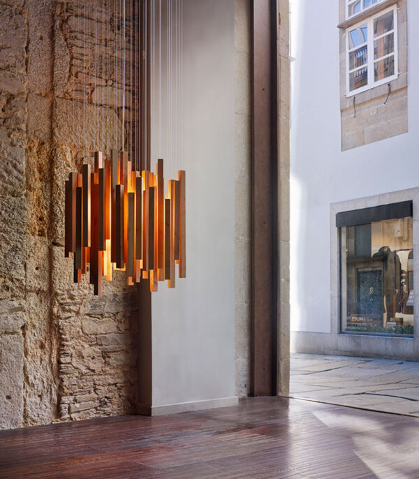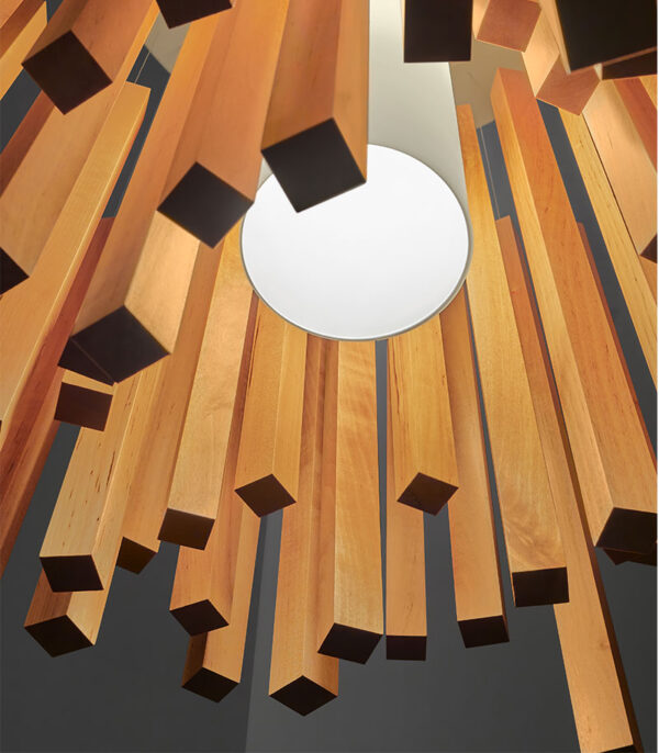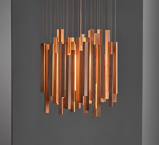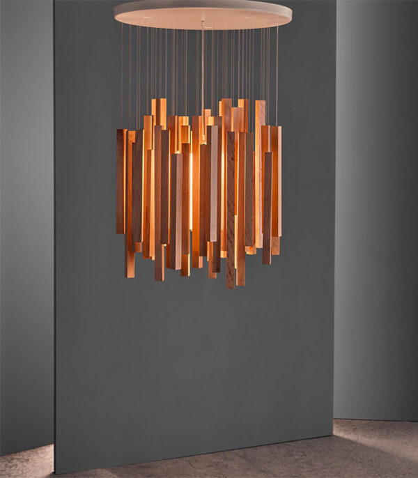 Designed by Héctor Serrano, this pendant lamp made with suspended wood pieces, reproduces the magic of a forest when light flows among its trees. A harmonious group of vertical lines at different heights that produce an enveloping game of lights and shadows. The naturalness of the wood confers this lamp, of restrained lines, elegance and warmth, looking as if it was waiting for the wind in a calm stillness.