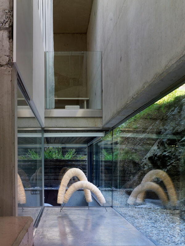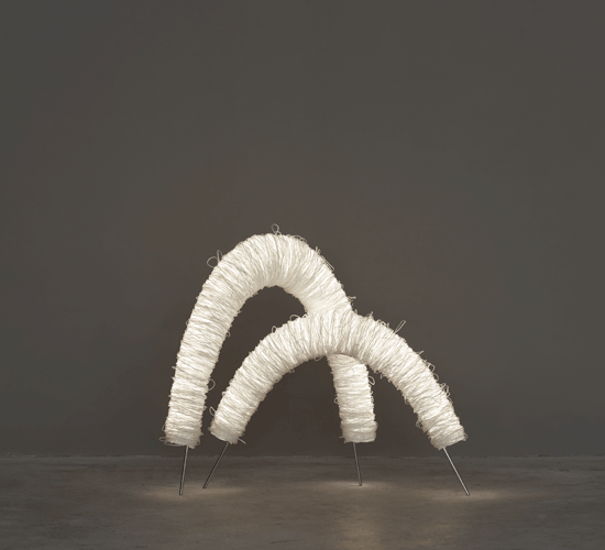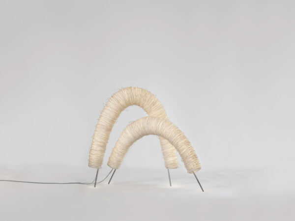 Inspirada en los bellos soportales de Santiago de Compostela, esta colección diseñada por Arturo Álvarez supone un particular tributo a los antiguos maestros artesanos de la ciudad. Arc lámpara de mesa es una pieza compuesta de dos arcos cruzados que contrastan su gran volumen arquitectónico con la suavidad del cordón japonés que las envuelve. La luz LED que las recorre de un lado a otro queda difuminada de una forma uniforme y elegante generando auténticas esculturas lumínicas.
