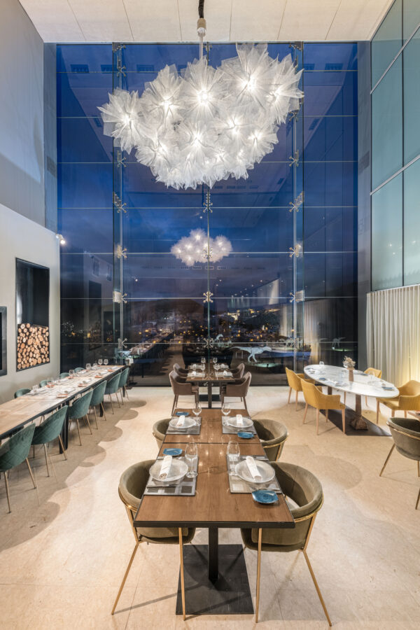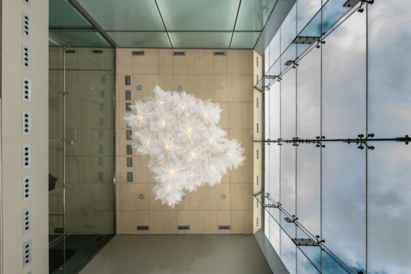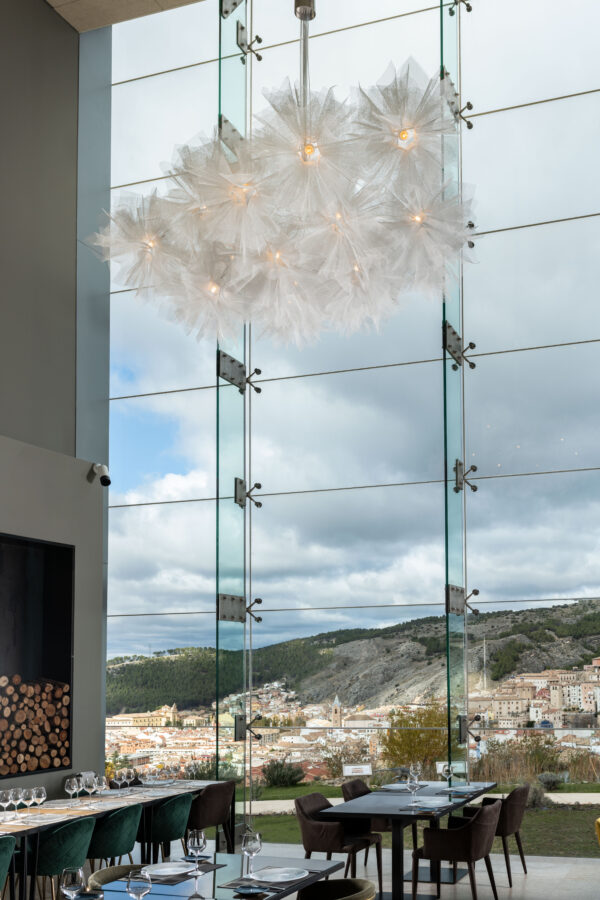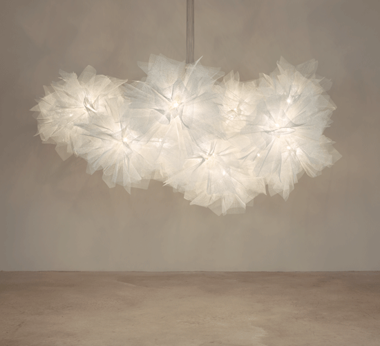 La lámpara Fluo diseñada por Arturo Álvarez forma parte de una colección de luminarias colgantes que se crean a partir de velos de malla de acero galvanizado pintada que se unen grácilmente en torno a un único punto de luz. La unión de varias piezas forman una Composición espectacular de grandes dimensiones. Fluo Compo grande es una forma ligera que reproduce la ilusión de un tejido vaporoso, como un tul semitransparente que revela y oculta a la vez, jugando con la intuición del que la observa. La ligereza de este diseño hecho a mano, que obtuvo un Good Design Award en 2009, se ve potenciada en las composiciones de mayor tamaño de la colección.