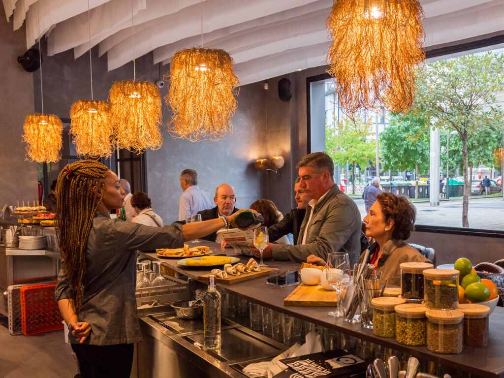 La diseñadora Ainara Arévalo es la responsable del proyecto de interiorismo de este local, que tiene en sus fogones a cocineros formados en restaurantes con estrellas Michelin, como Azurmendi y Etxanobe.