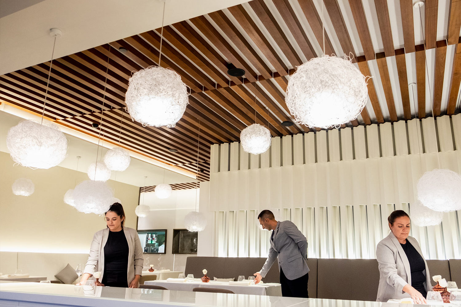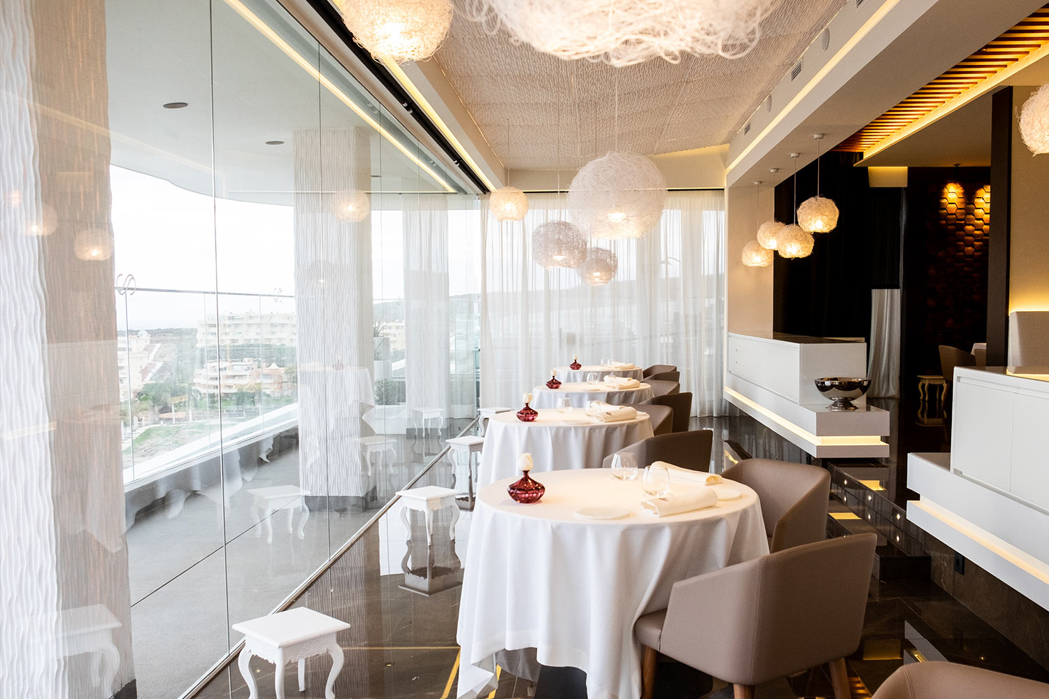 The Royal Hideaway Corales Resort Hotel welcomes in its space “El rincón de Juan Carlos”, the restaurant with a Michelin Star and 2 soles from the Padrón brothers. This new gastronomic space has been designed by interior designer Mercè Borrell where she has combined familiarity with a timeless and elegant design. The Catalan Mercé counted on an emotional light by our brand for the development of custom decorative lighting. This restaurant overlooking the Atlantic has numerous hanging Pili lamps that simulate clouds made in a special size. The ceiling, made up of more than 30 Planums, are panels made of painted stainless steel mesh that simulate the sky and that extend to the columns of the restaurant.