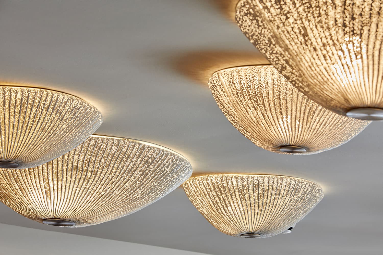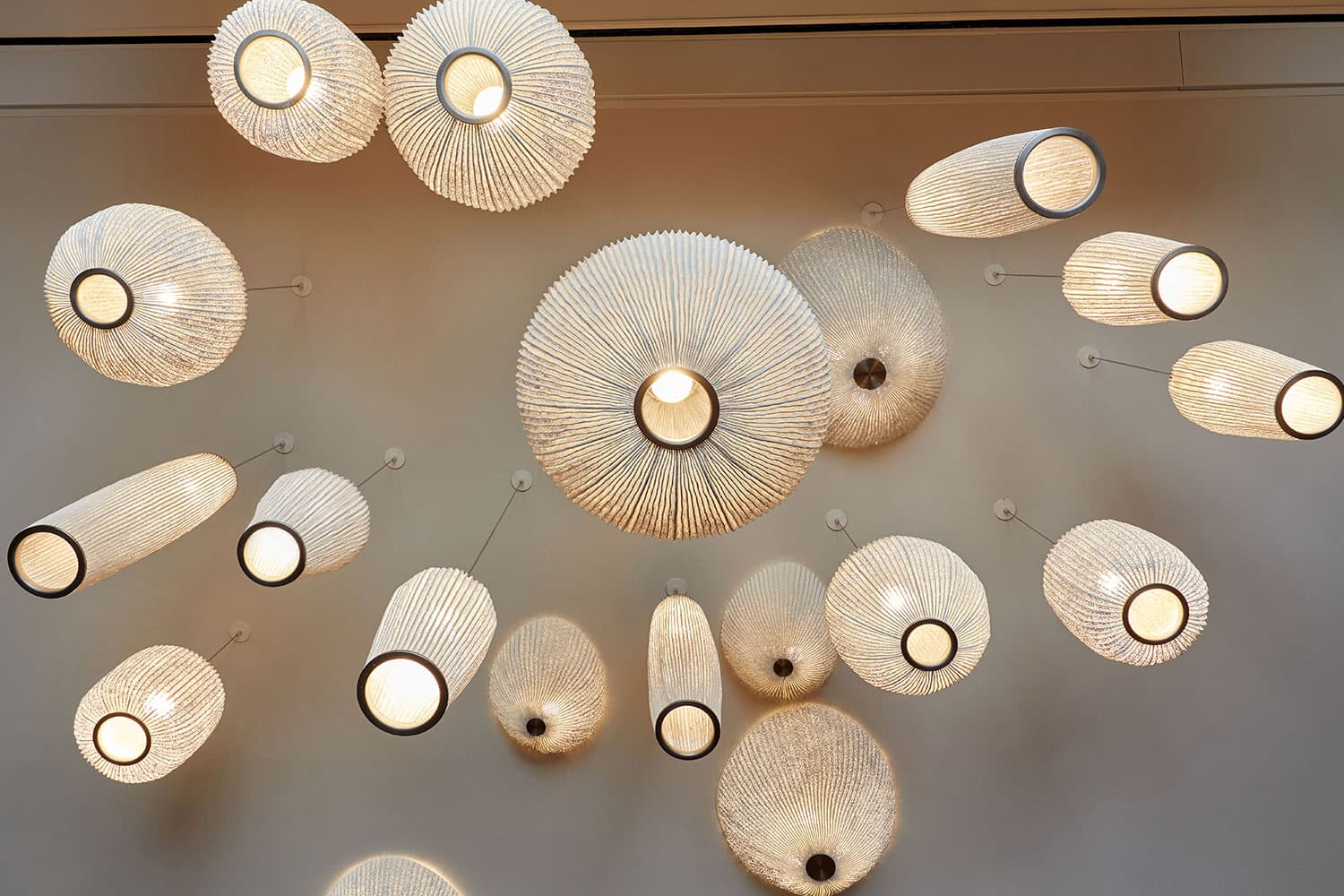 Luisa López Telleira has been in charge of reforming the Hotel Lasala – San Sebastian. This space overlooking the sea, is illuminated by designs by Arturo Álvarez. In the hall, Onn in its ceiling version and the Coral collection, form a great composition with a strong marine identity. The fusion of these two models in a tailored composition, welcomes and guides visitors and guests at the entrance.
